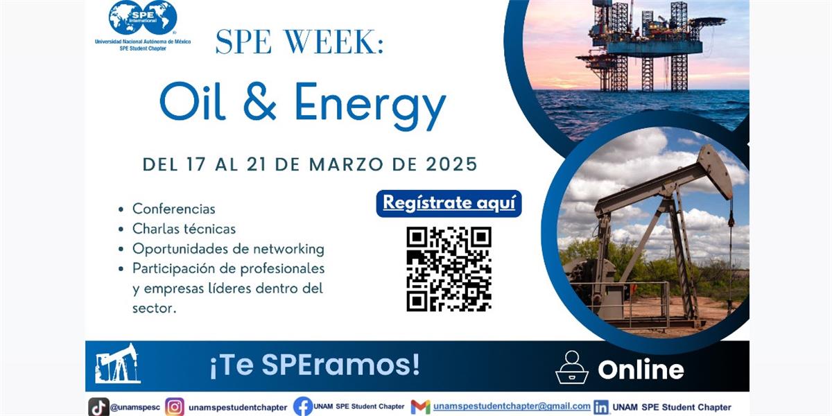 The student chapter UNAM invites you to SPE Week: Oil & Energy, which will take place online from March 17 to 21.