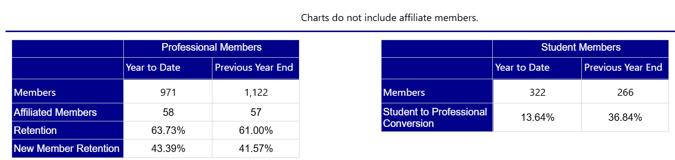 Compare your own figures against previous performance - with the aim to maintain or increase growth, retention, and student to professional member conversion in the long term.