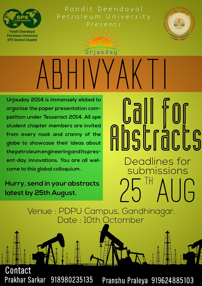 Urjauday feels the immense pleasure and pride to organise a Paper Presentation Competition "ABHIVYAKTI" during the "Tesseract" techno-fest scheduled for the 10th and 11th of October this year. The contest seeks to invite novel ideas from the young budding minds that belong to the oil and gas sector. Interested participants can mail their abstracts latest by 25th August (12:00 am) to urjauday2014.submissions@gmail.com