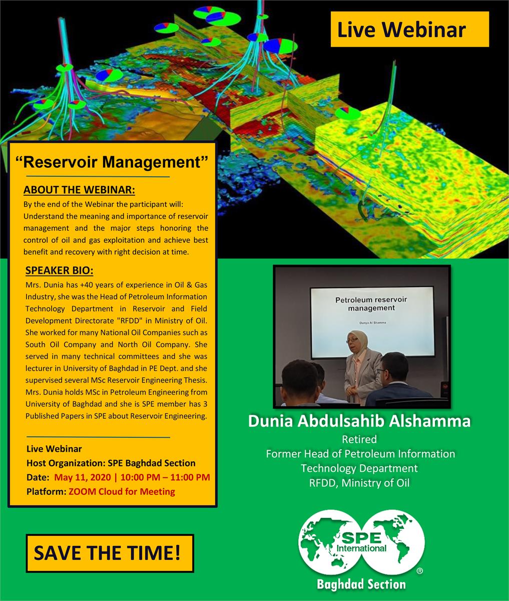 We are pleased to invite you to participate in a new live Webinar with a new Industry Professional, this Webinar titled "Reservoir Management" and will be organized by our section.