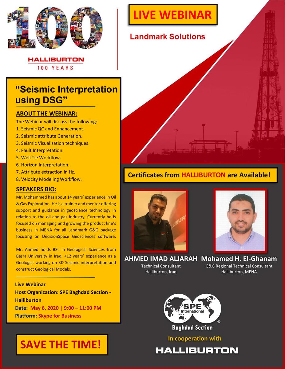 For that, we are pleased to invite you to participate in the 4th live Webinar titled "Landmark Solutions - Seismic Interpretation using DSG" that will be held in cooperation between SPE Baghdad Section and Halliburton - Landmark, Iraq.