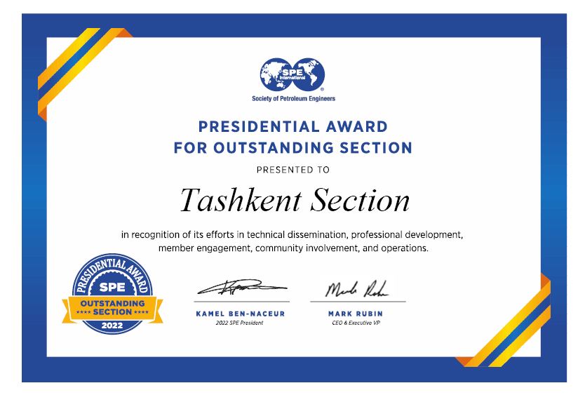 Хотелось бы поздравить всех членов Ташкентской секции SPE c присуждением Президентской Награды SPE (Presidential Award for Outstanding Section) за выдающиеся достижения секции в 2021 году. Президентская награда SPE – это высший знак отличия, которая присуждается 5% лучшим секциями SPE по всему миру.