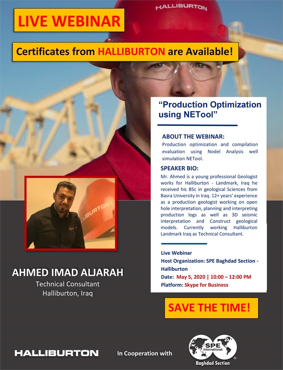 For that, we are pleased to invite you to participate in the 2nd live Webinar titled "Landmark Solutions - Production optimization using NETool" that will be held in cooperation between SPE Baghdad Section and Halliburton - Landmark, Iraq.