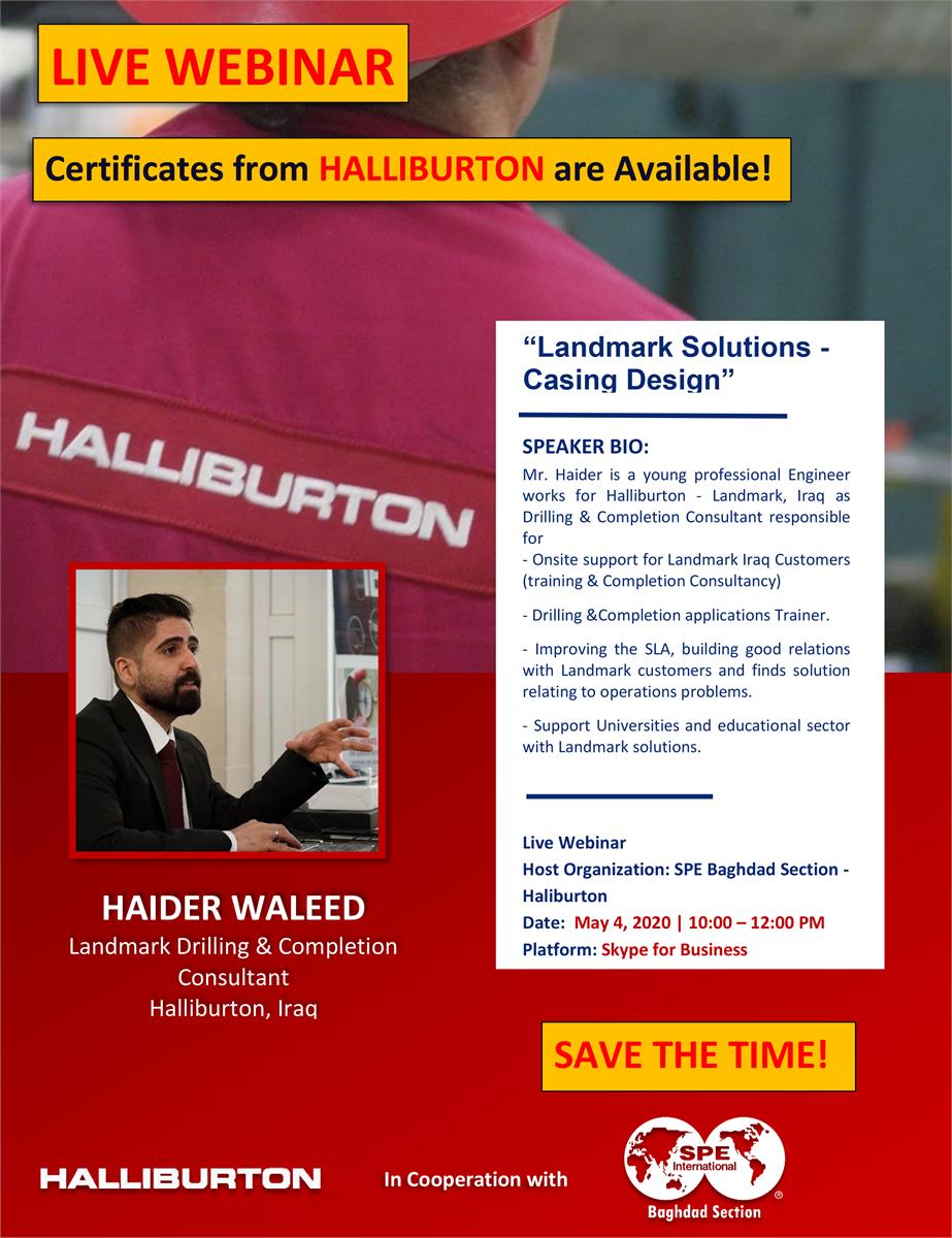 For that, we are pleased to invite you to participate in the 2nd live Webinar titled "Landmark Solutions - Casing Design" that will be held in cooperation between SPE Baghdad Section and Halliburton - Landmark, Iraq.