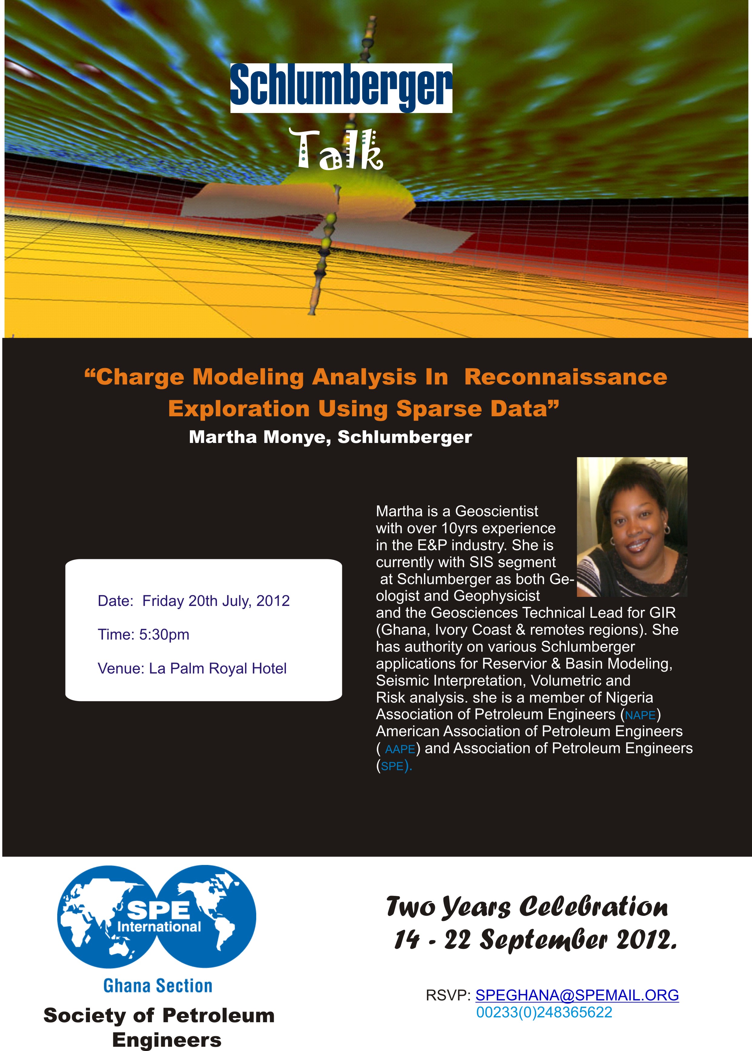 There is no discipline in the Petroleum value chain that maximizes the integration of multidisciplinary data and knowledge as reservoir characterization does. Speaker: Martha Monye, Schlumberger Admission: FREE ...................