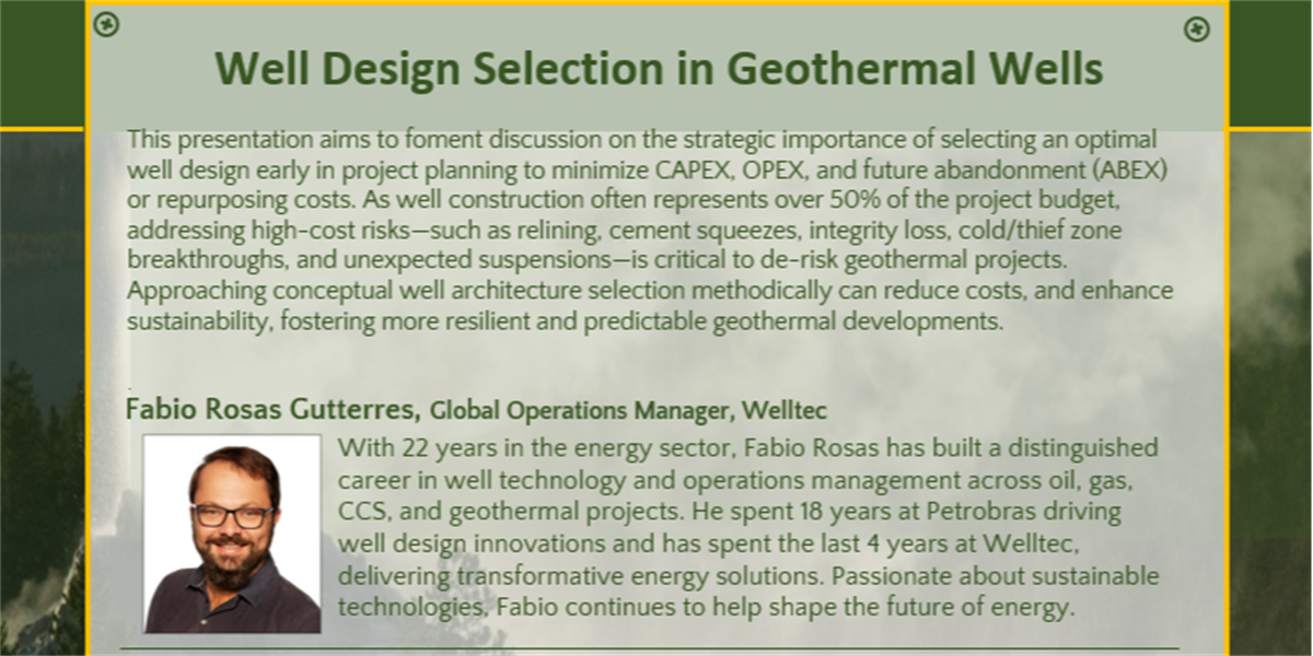 Looking forward to have Fabio Rosa from Welltec join us in December and shed light on well design concepts in the geothermal world. A lot of the costs and risks are associated with this project phase and it is of paramount importance for us to understand processes and work on optimizing them for improved project technical and economic outcomes!