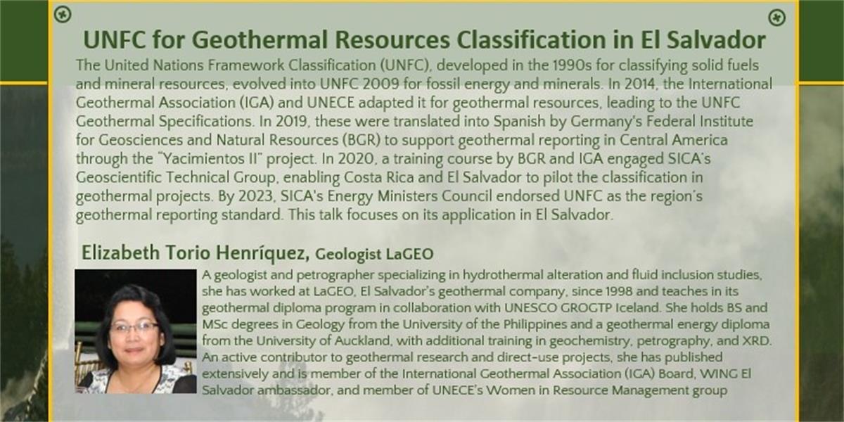 ๐), developed in the 1990s for classifying solid fuels and mineral resources, evolved into UNFC 2009 for fossil energy and minerals. In 2014, the International Geothermal Association (IGA) and UNECE adapted it for geothermal resources, leading to the UNFC Geothermal Specifications. In 2019, these were translated into Spanish by Germany's Federal Institute for Geosciences and Natural Resources (BGR) to support geothermal reporting in Central America through the โYacimientos IIโ project. In 2020, a training course by BGR and IGA engaged SICAโs Geoscientific Technical Group, enabling CostaRica and ElSalvador to pilot the classification in geothermal projects. By 2023, SICA's Energy Ministers Council endorsed UNFC as the regionโs geothermal reporting standard. This talk focuses on its application in El Salvador
