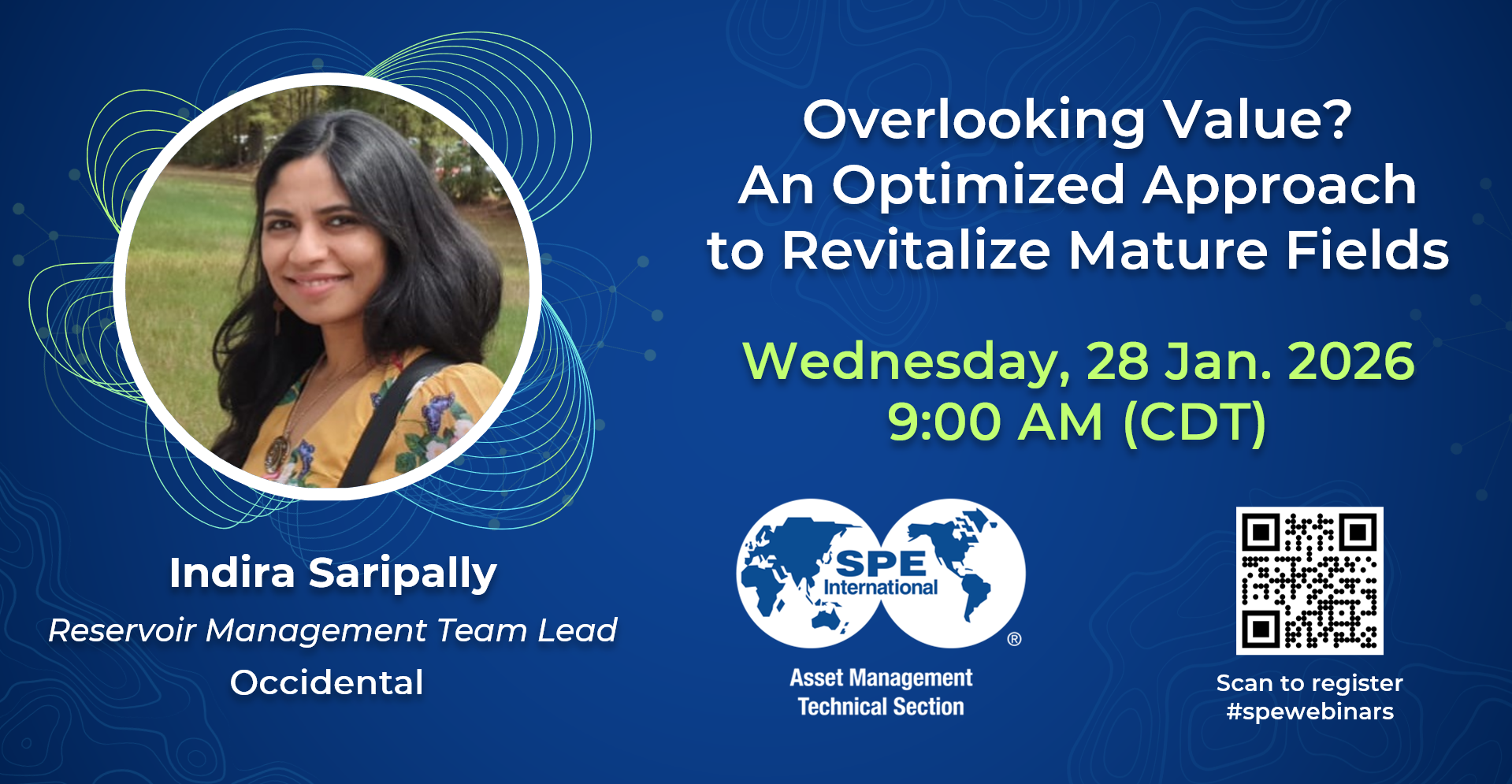 About the speaker: Indira Saripally has 18+ years of experience in reservoir management and mature field revitalization across U.S. and Middle East assets. She holds an MSc in Petroleum Engineering from Stanford University, a BSc from IIT, and serves on the SPE JPT Executive Review Board.